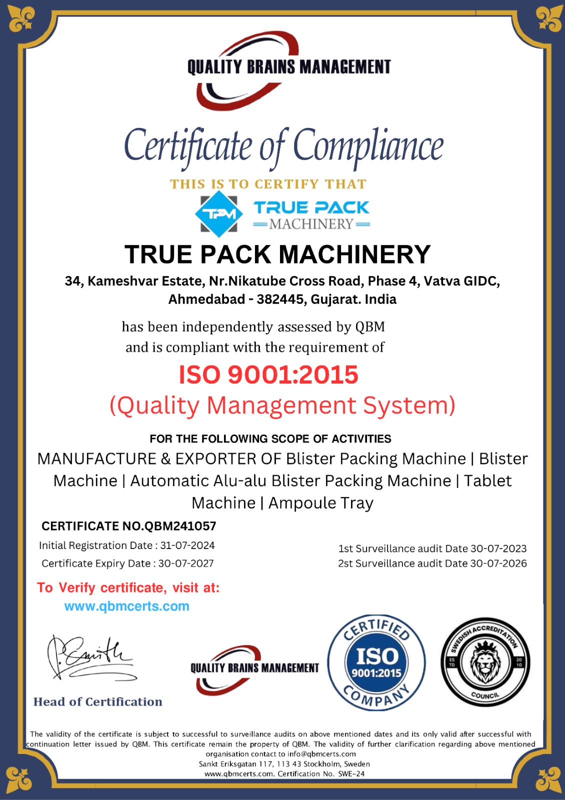 34, Kameshvar Estate, Nr.Nikatube Cross Road, Phase 4, Vatva GIDC, Ahmedabad - 382445, Guj. India